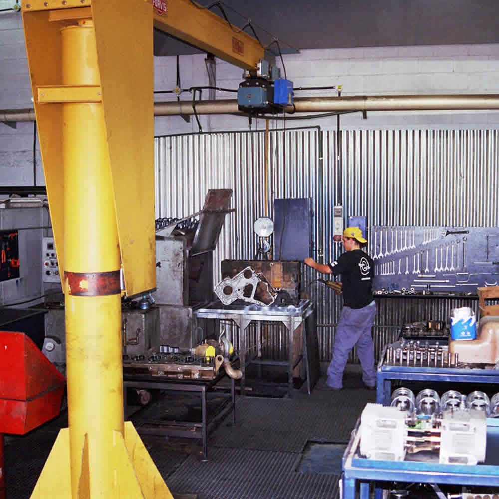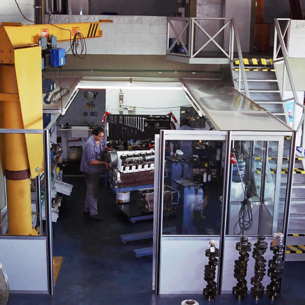 Sector taller de motores, área de desarme, moderno lavadero de piezas, evaluación de componentes y boxes de montaje de motores, con personal dedicado de acuerdo al rango de potencia.